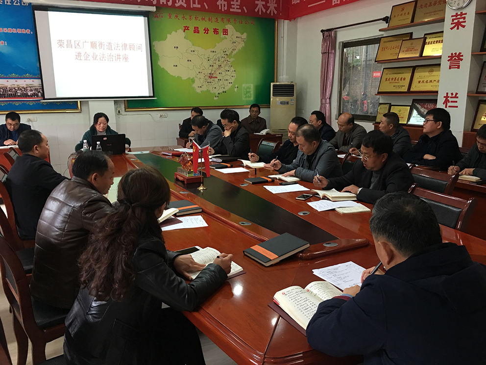 11月11日,榮昌廣順?biāo)痉ㄋ芩L(zhǎng)、鄧主任來(lái)到永榮機(jī)制公司開(kāi)展普法講座,該公司領(lǐng)導(dǎo)、中干共21人接受普法知識(shí)教育。該公司董事長(zhǎng)、黨委書(shū)記蒲江平到現(xiàn)場(chǎng)聽(tīng)講,并對(duì)廣順?biāo)痉ㄋ辗ㄟM(jìn)企業(yè)表示感謝。蒲董事長(zhǎng)指出,企業(yè)在改革發(fā)展進(jìn)程中正需要這樣的講座來(lái)規(guī)范管理人員行為,幫助企業(yè)依法發(fā)展,并希望與廣順?biāo)痉ㄋ3致?lián)系,提供更多的機(jī)會(huì)保證相關(guān)法律規(guī)定入腦入心,指導(dǎo)實(shí)際工作。