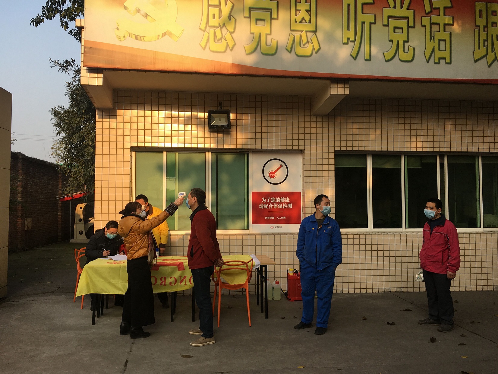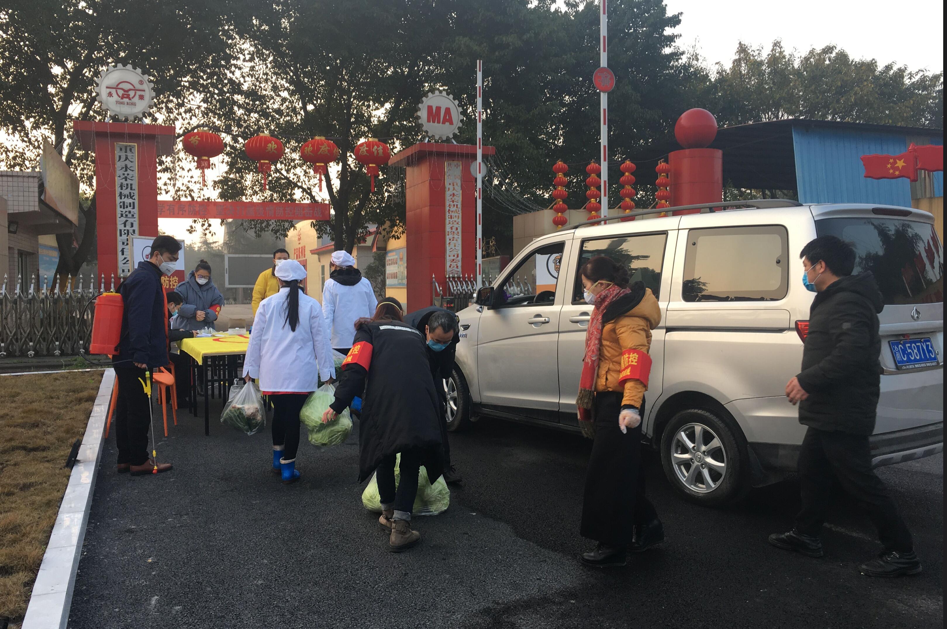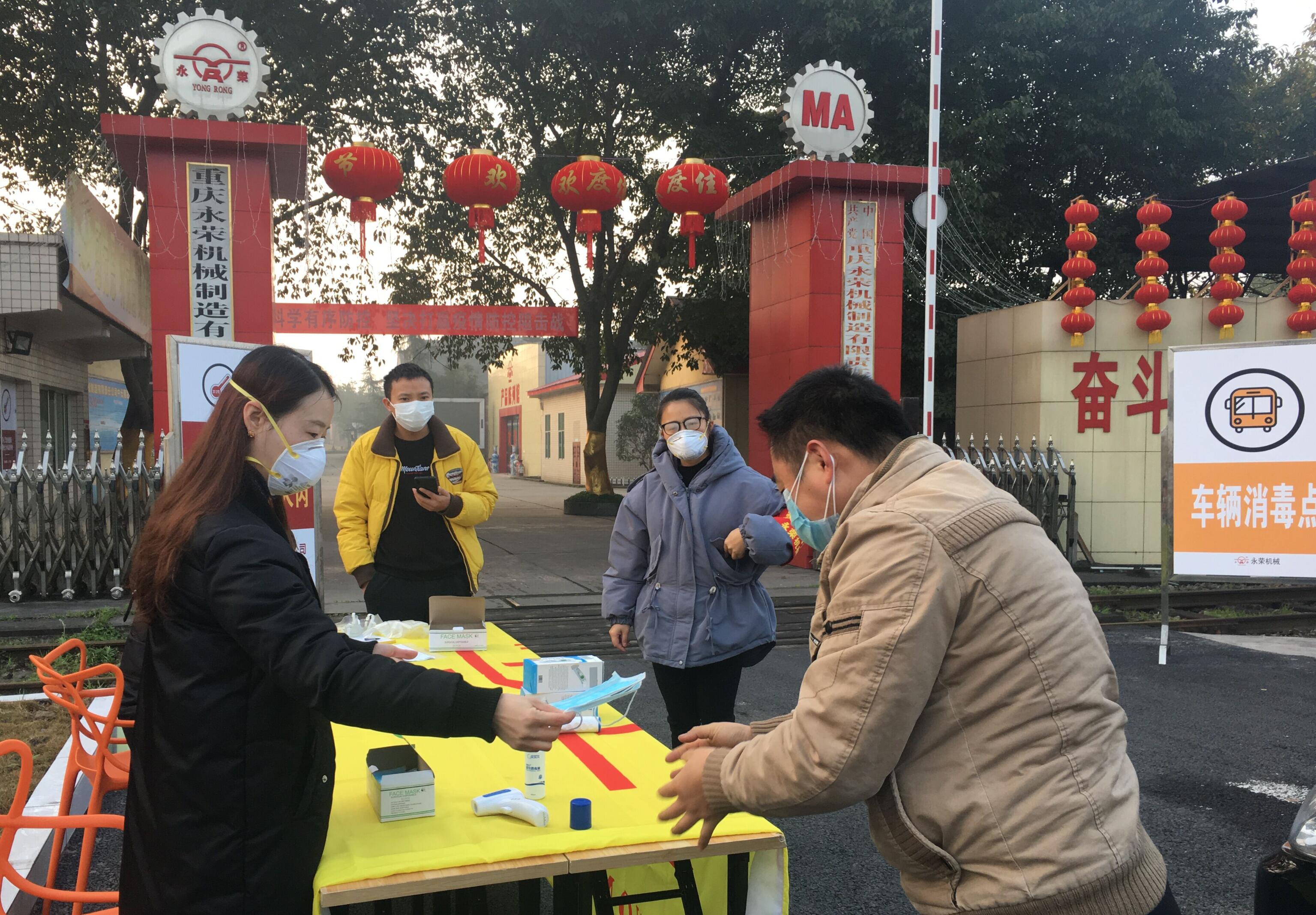 2020年2月12日,永榮機制公司在獲得復工許可后嚴格按照疫情防控要求,以“最小化”方式運行,實行部分員工現(xiàn)場復工和居家辦公相結合,盡量減少人員流動和人員聚集。(圖為復工第一天員工入廠體溫檢測、發(fā)放口罩和車輛消毒)