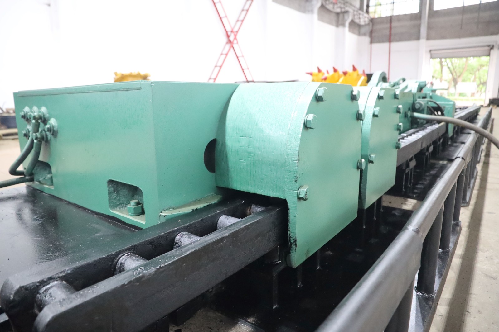 結(jié)構(gòu)特征 騎溜式、單搖臂、液壓牽引薄煤層滾筒式采煤機。